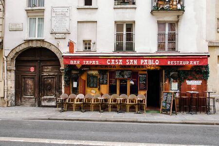 Paris, France - August 11, 2017. Typical street in Paris with french cafe or restaurant in classical building with summer terrace, old wooden gates and windows with blinds.