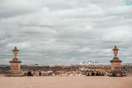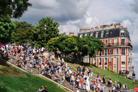 Paris, France - August 10, 2017. Lot of people on steps of Sacre Coeur, Montmartre stairway crowded of people. Crowd of tourist on steps to Basilica of the Sacred Heart of Paris by cloudy day.