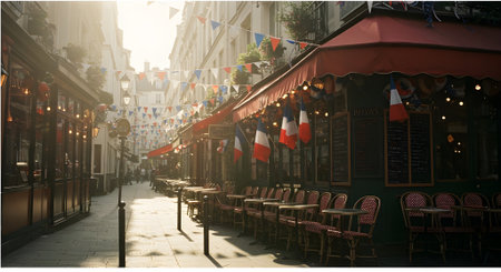 Romantic cobblestone street in Paris with restaurants and Bastille Day banners creating a cozy atmosphere.