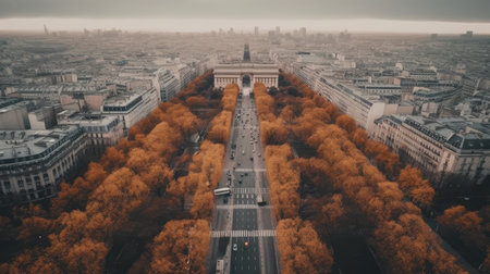 Paris, panoramic aerial view of Champs Elysees boulevard. France, Europe.