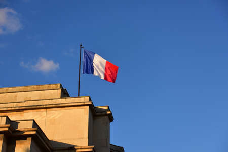 French flag waving in the air at sunet during a sunny afternoon. The french flag, or drapeau francais, is the national emblem and banner of the republic of France.