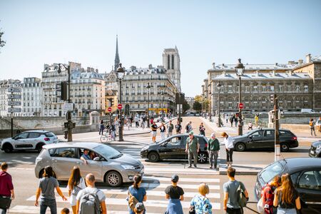 PARIS, FRANCE - September 01, 2018: Crowded street with cars and people with Notre-dame cathedral on the background