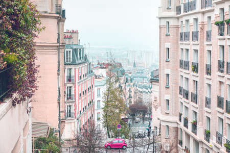 View of street with stairs in quarter Montmartre in Paris, France. Cozy cityscape of Paris at summer. Architecture and landmarks of Paris.