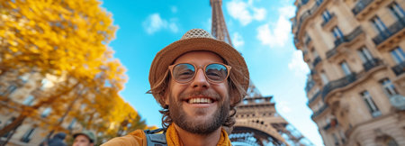 In front of the Eiffel Tower in Paris, France, a content man is taking a selfie.