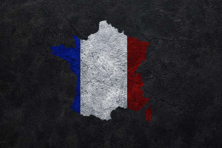 Painted map of France in colors of national flag on dark grunge background