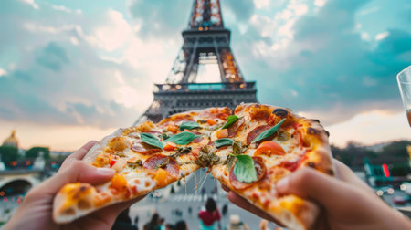 tourist eating pizza in front of the eiffel tower generative ai