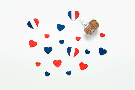 Hearts in the colors of the French flag and a french champagne bottle cork on a light background, top view, Bastille Day and French National Day concept