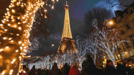 Tourists admiring eiffel tower glowing during christmas holidays in paris, france