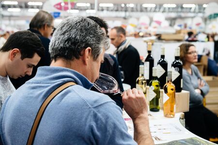 Strasbourg, France - Feb 16, 2020: Man tasting French wine at the Vignerons independant English: Independent winemakers of France wine fair for private and horeca customers