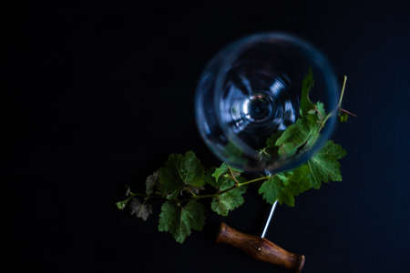 Drink concept with empty wine glass, vintage corkscrew and grape vine green leaves on dark wooden table with copy space