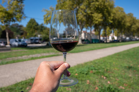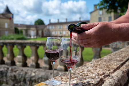 Red dry Bordeaux wine tasting in wine making Pauillac village, Haut-Medoc vineyards in Bordeaux, sunny day, left bank of Gironde Estuary, France