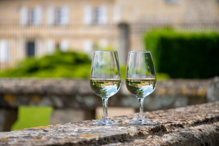 Tasing glasses of white wine in old wine domain on Sauternes vineyards in Barsac village and old castle on background, Bordeaux, France