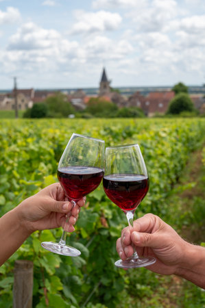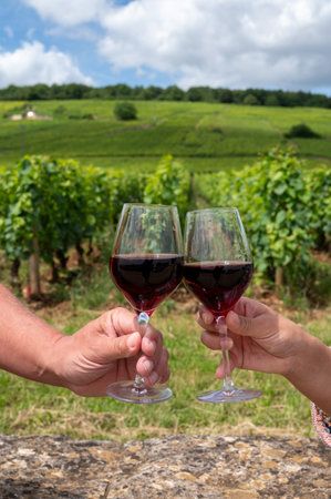 Tasting of red pinot noir wine on vineyards with stone walls, making of famous red and white wine in Burgundy region, Vosne-Romanee village, France