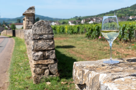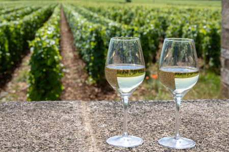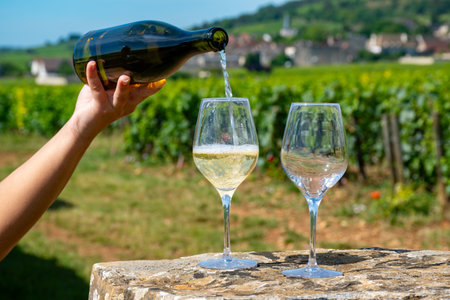 Tasting of high quality white dry rare wine made from Chardonnay grapes on grand cru classe vineyards near Puligny-Montrachet village, Burgundy, France