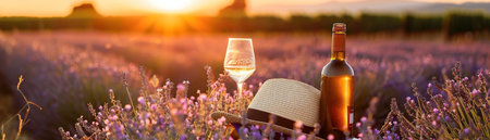 A serene picnic scene with a bottle of wine, glass, and straw hat set amongst lavender fields as the sun sets.