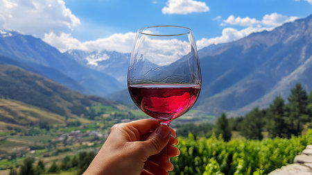 Wineglass with red wine in hand against the background of the mountains
