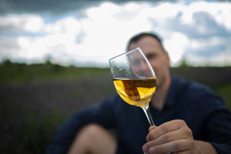 Glass white wine lavender field. Woman hand holds a glass with lavander and wine in the Lavender field at sunset Violet flowers on the background.. Conscious consumption. Wellness and natural concept