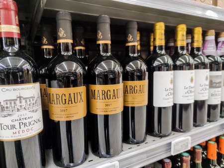 Supermarket shelves filled with many bottles and brands French wines