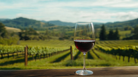 A beautifully composed image of a glass filled with red wine set against a breathtaking vineyard landscape, showcasing rolling hills and lush grapevines.