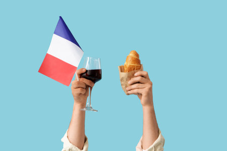 Male hands with French flag, glass of wine and croissant on blue background