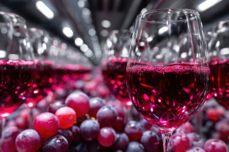 Glasses of red wine are showcased atop fresh, ripe grapes in a modern winery during a vibrant tasting event.