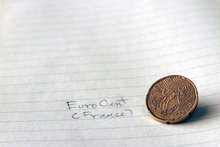Twenty France euro cent on obverse, Line image of The Sower, a long-standing symbol of France surrounded by the twelve stars, on the book.