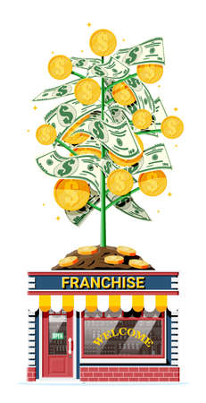 Successful franchise business with money tree. Franchising shop building or commercial property. Real estate business promotional, sme. Selling buying new business. Flat vector illustration