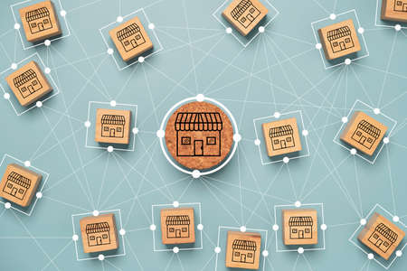 Business sale growth and expand shop franchise concept, Store illustration print screen on wooden cube block connection link with others shop and supermarket.