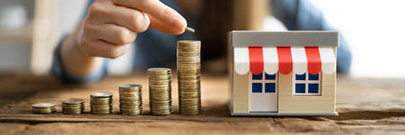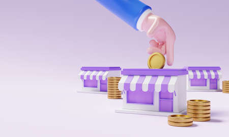 Collect money from a start-up business mini-mart that owns a business with businessman hand as an entrepreneur. Financial economy e-commerce and money-saving money concept. 3D illustration rendering