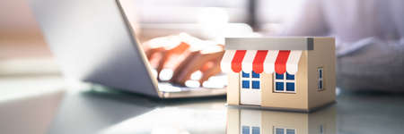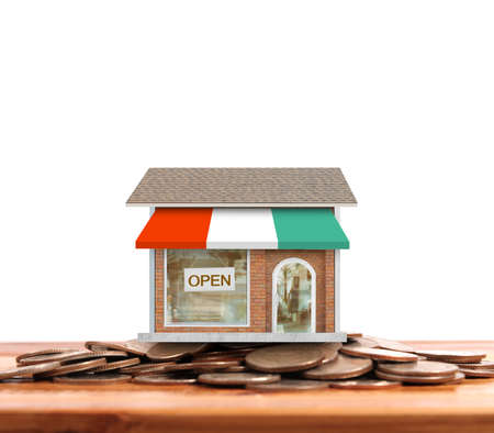 Business sale growth and expand shop franchise concept, Store illustration print screen on wooden cube block and lay down on the top of increasing coins stacking .Shopping and business sale growth.