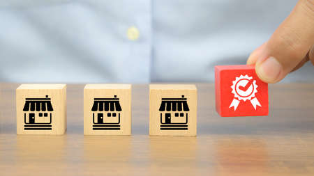 Close-up hand choose quality symbol on cube wooden toy blocks stacked with franchise business store icons for small business growth and branch expansion strategy of financial marketing planning.