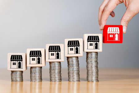 Close-up hand choose cube wooden toy blocks place in line up with franchise business store icon. for small business growth and branch expansion strategy of financial marketing planning.
