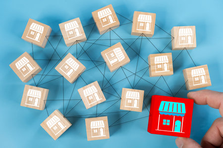 Wooden blocks arranged in a network, representing interconnected stores or businesses, with one block highlighted in red.