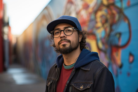 Hispanic male graffiti artist posing in front of colorful mural