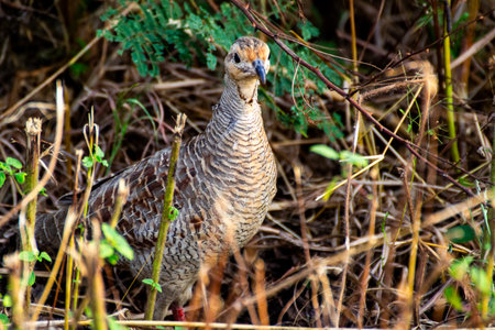 A closeup shot of a Grey Francolin bird taken in a jungle.