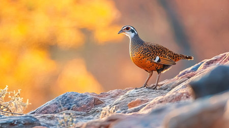 A vibrant bird stands gracefully on a rock, illuminated by soft sunlight and surrounded by warm autumn hues, embodying the beauty of nature.