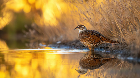 A Northern Bobwhite family gathered around a watering hole, their colorful feathers highlighted by the soft morning light.