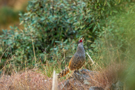 cheer pheasant or Catreus wallichii or Wallich's pheasant portrait during winter migration perched on big rock in natural green background in foothills of himalaya forest uttarakhand india