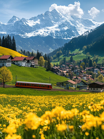 Picturesque Swiss village by a serene lake, mountains as a backdrop. Tranquil atmosphere