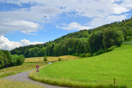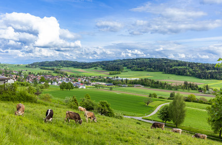 Small village in Alps at sunset. Swiss landscape with forests and meadows early in the morning. Agriculture in Switzerland, arable land and pastures.