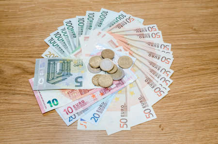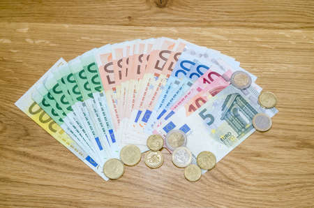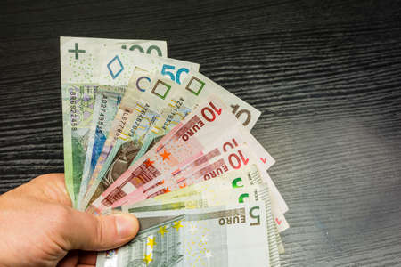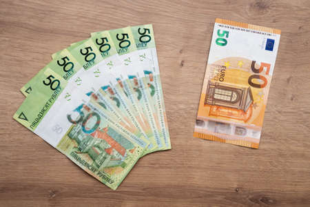 Belarusian paper money with Euro on wooden background. Concept of the exchange rate and exchange transactions