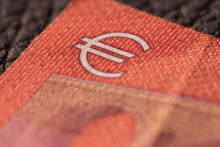 Selective focus on detail of euro banknotes. Close up macro detail of money banknotes, 20 euro isolated. World money concept, inflation and economy concept