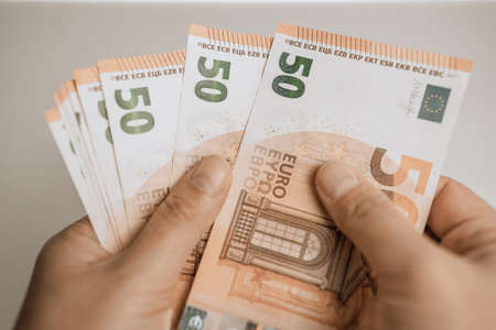 Woman hands with euro money on grey background. Man counting money, economy concept, money distribution