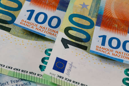 The euro banknotes and Swiss paper money placed together express the relationship between the Swiss franc and the currency of the European Union. EUR and CHF currencies.