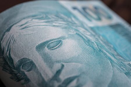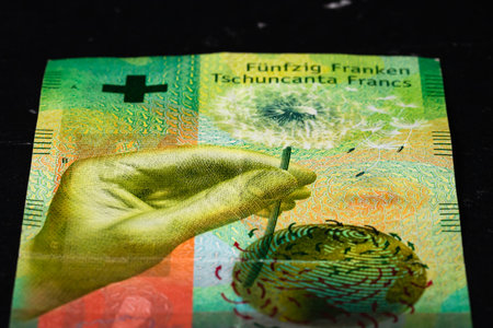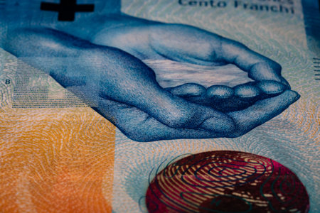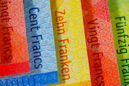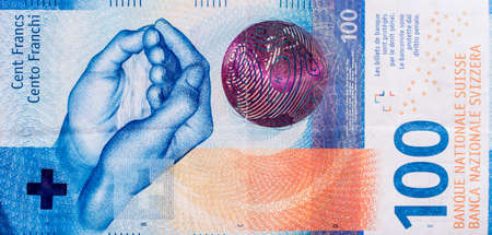 Selective focus on detail of 100 swiss franc banknote. Close up macro detail of money banknotes, swiss franc isolated. World money concept, inflation and economy concept