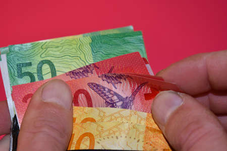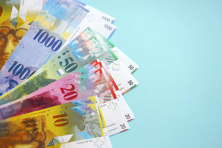 Vaduz, Liechtenstein, November 22, 2021 Swiss currency in cash on a red background