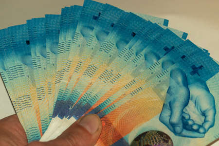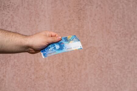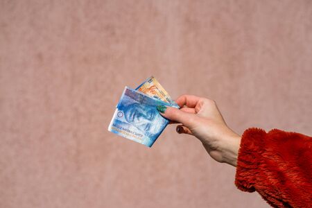 Hand holding showing euro money and giving or receiving money like tips, salary. 100 swiss franc banknotes CHF currency isolated. Concept of rich business people, saving or spending money.