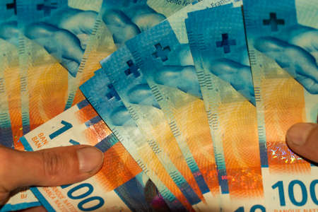 Many swiss francs bills in cash with a value of one hundred each 27.5.2021