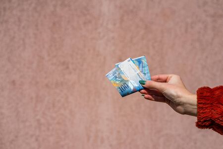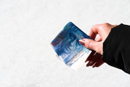 Woman hand holding and giving money. World money concept, close up of 100 swiss franc banknote, photo of CHF currency isolated. Hand holding money, swiss franc