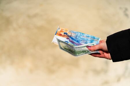 Woman hand holding and giving money. World money concept, close up of 100 swiss franc banknote and 100 US dollar, photo of CHF and USD currency